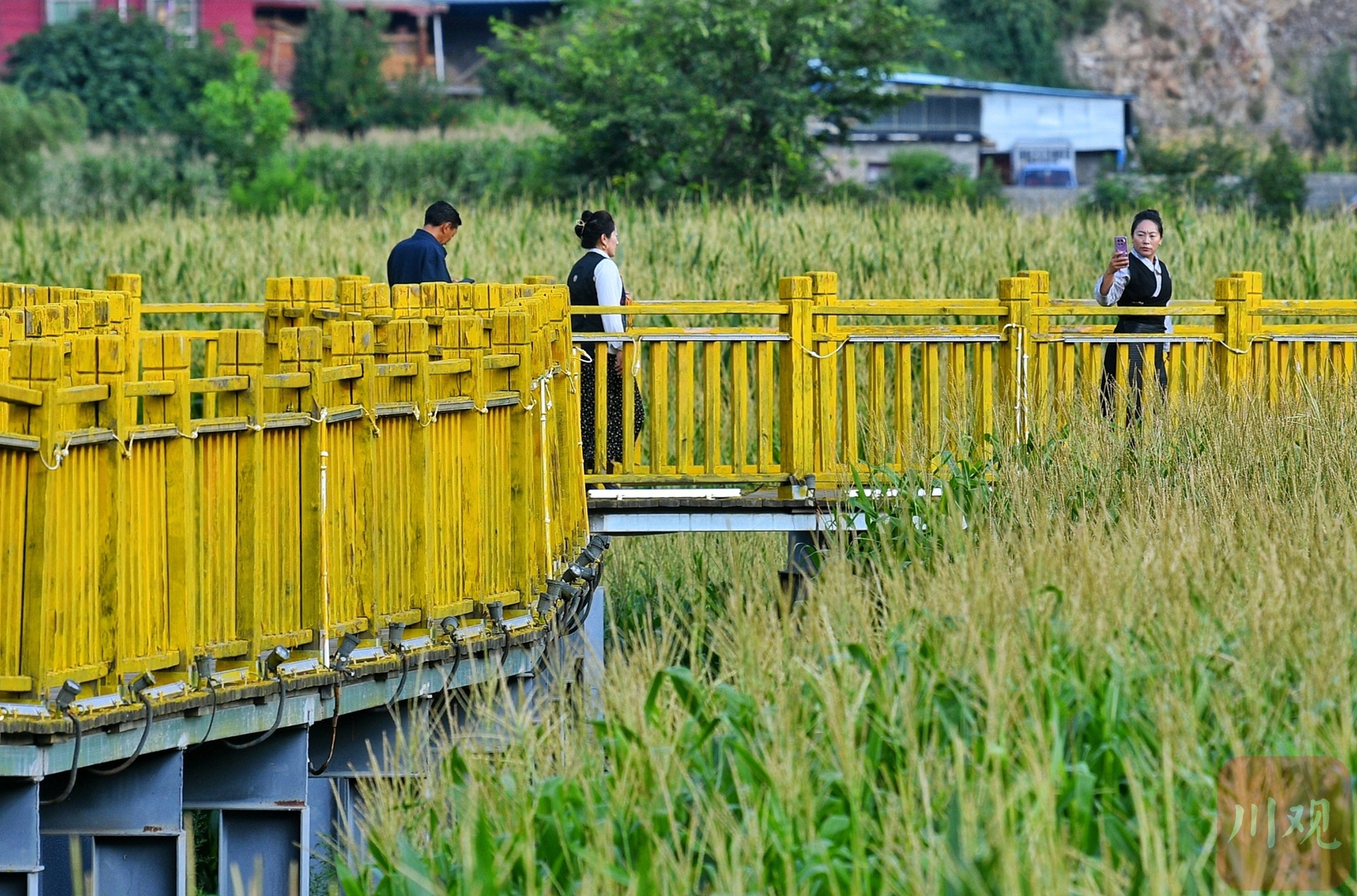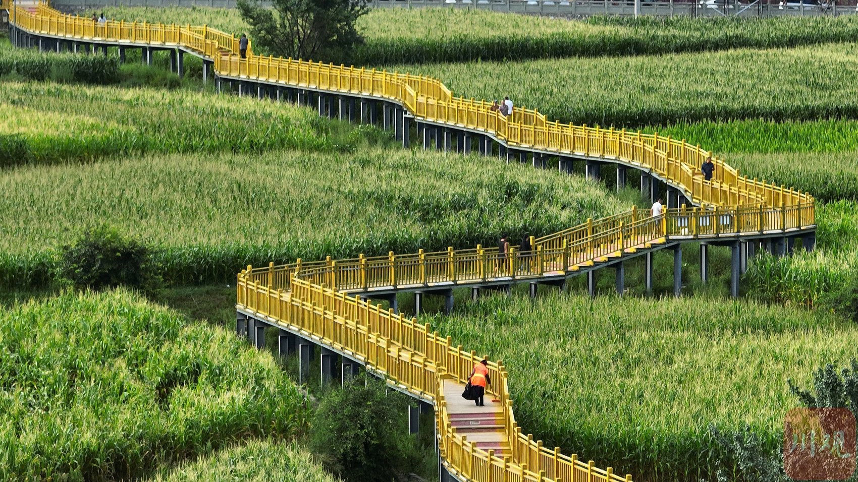 28日晨,記者從住地步行到縣城邊的“田園棧道”,只用了10分鐘。此時晨光中天色已泛藍(lán),田地里懸空架起的棧道,從郁郁蔥蔥的玉米田里一直曲折延伸,從空中俯瞰如同黃色哈達(dá)纏繞在翠綠田間,此景讓人眼前一亮。