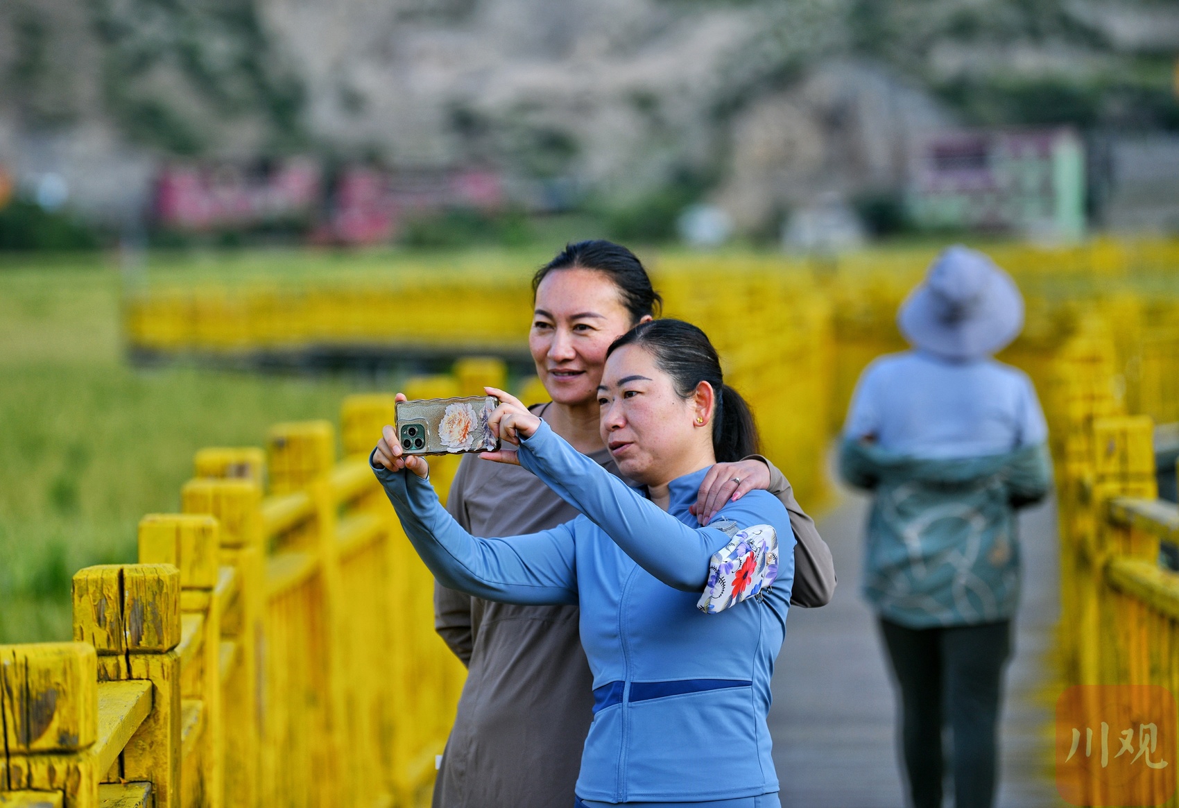據(jù)了解,“田園棧道”是巴塘縣在農(nóng)旅結(jié)合、觀光農(nóng)業(yè)方面作為亮點打造的特色景點,現(xiàn)如今是網(wǎng)紅地,不少自駕游的旅行者都會慕名前來田園棧道打卡。吸引的不止是游客,當(dāng)?shù)鼐用褚蚕矚g早晚來這里漫步??吹接浾咴谂恼?,棧道上晨練的當(dāng)?shù)厝诵χ垼骸斑@里漂亮吧,每天都有像您這樣的人拿著相機(jī)來拍照,拍完就走一圈,走棧道一圈只需要2500步。”