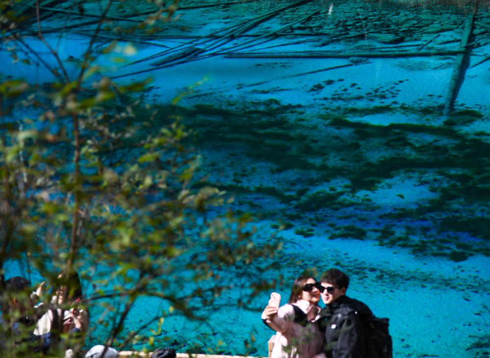游客在九寨溝景區(qū)觀(guān)光留影。新華社記者 王曦 攝