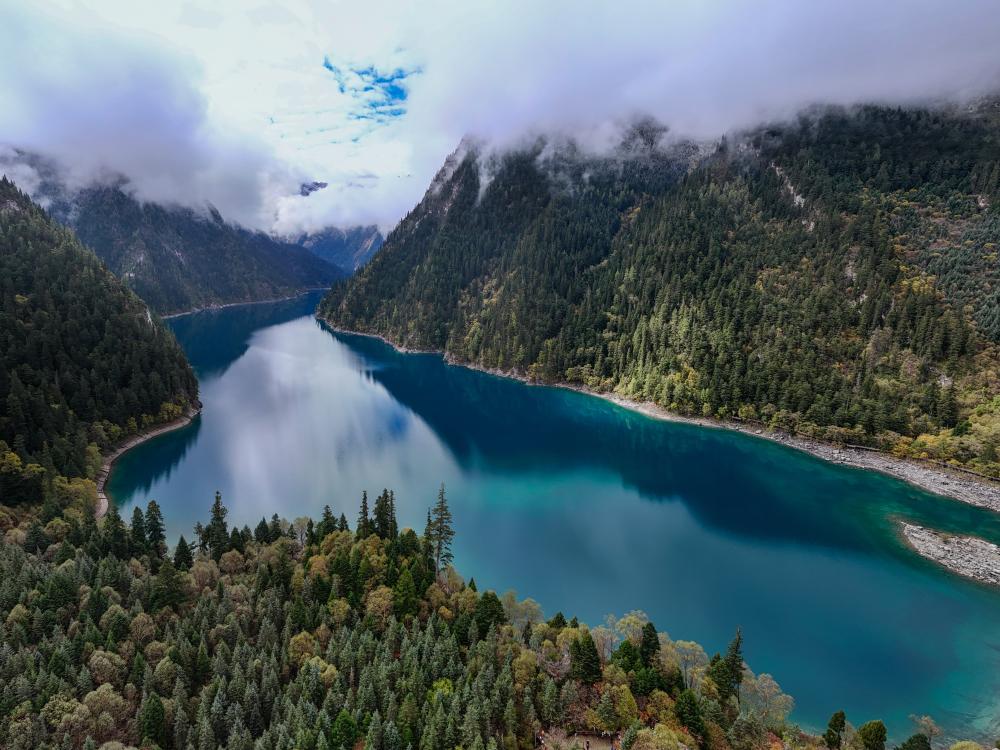 從高空中俯瞰,樹(shù)正溝、日則溝和則查洼溝3條主溝呈不規(guī)則的“Y”字形躺臥于九寨溝起伏的峰巒之間。數(shù)以萬(wàn)計(jì)的游客散落在綿延40多公里的狹長(zhǎng)溝谷內(nèi),卻并不顯得擁擠。