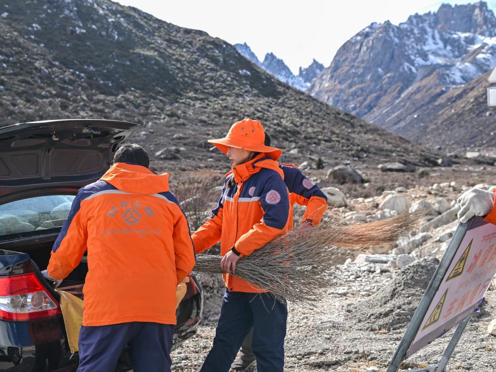 11月1日,呷瑪澤錯(右)和同事正在整理道路養(yǎng)護工具。新華社記者 王曦 攝