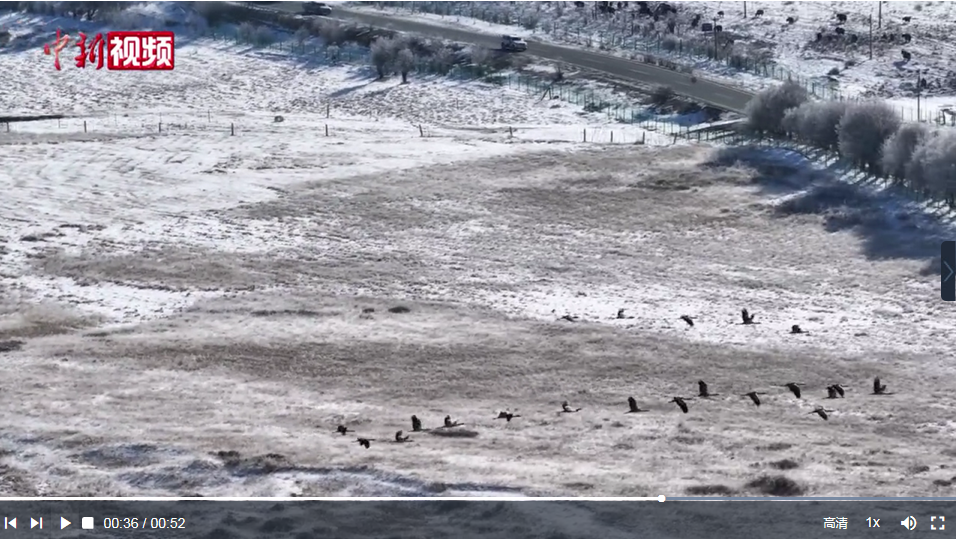 近日,在四川省阿壩州紅原縣月亮灣濕地成群的黑頸鶴遷徙“大軍”在空中翩翩起舞,它們時而排成一排,時而散開,上演了一場高空“飛行大片”。
