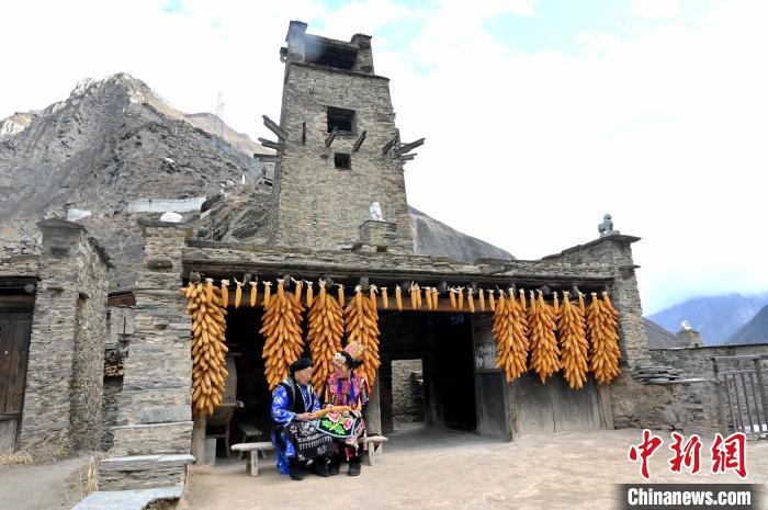 25日,桃坪羌寨內(nèi)的居民正在聊天。中新社記者 安源 攝