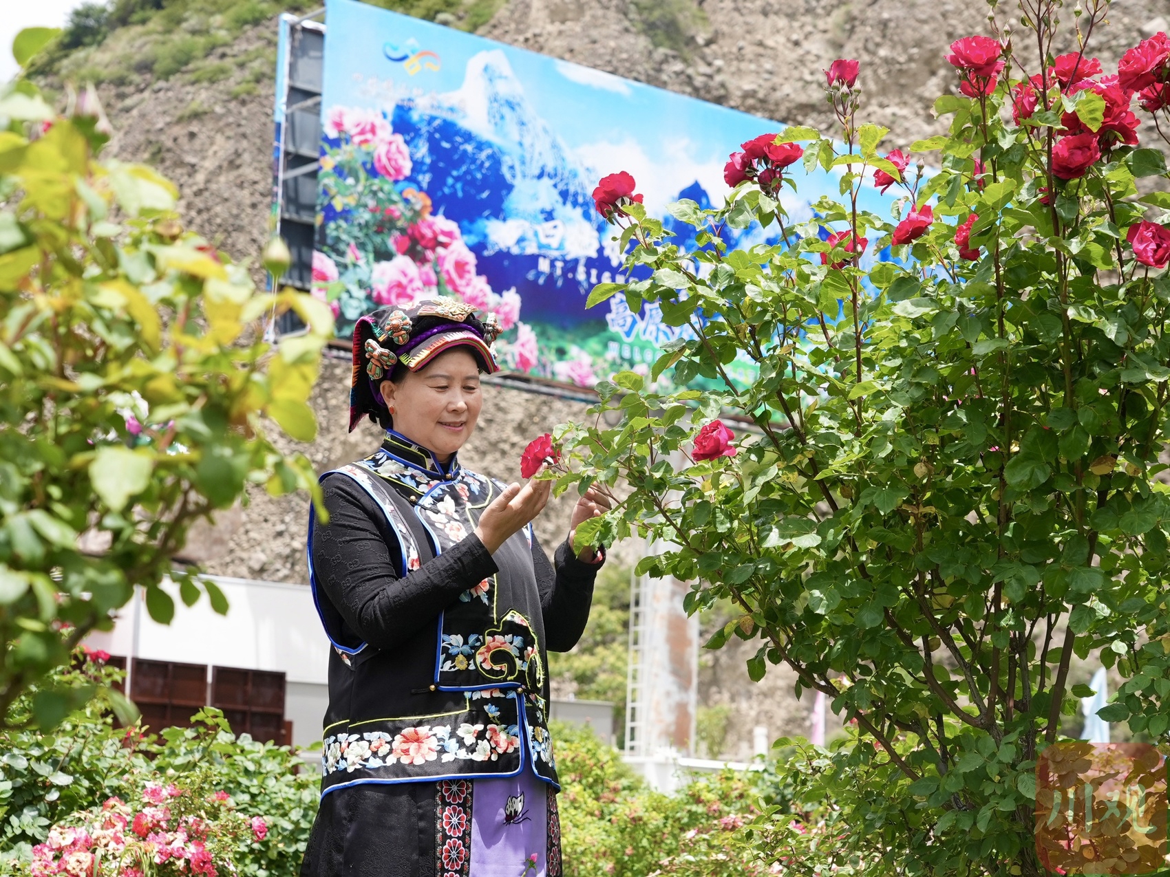 小金縣達(dá)維鎮(zhèn)冒水村黨支部書(shū)記陳望慧在玫瑰生產(chǎn)基地內(nèi)欣賞玫瑰花。