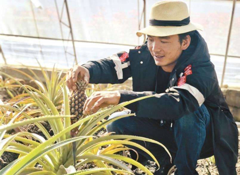 近年來,西藏拉薩曲水凈土健康產(chǎn)業(yè)園加大科技投入,積極引進(jìn)新產(chǎn)品試驗試種,調(diào)整種植結(jié)構(gòu),拓寬群眾增收渠道。圖為工作人員展示園區(qū)新試種的菠蘿。記者 凃瓊攝