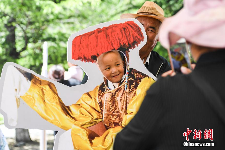 5月25日,2019年“藏戲演出季”第二場(chǎng)演出在西藏拉薩布達(dá)拉宮腳下的宗角祿康公園開演。據(jù)了解,2019年藏戲演出季將持續(xù)到今年的7月20日,每周六來(lái)自拉薩八縣區(qū)的優(yōu)秀藏戲隊(duì)將相繼進(jìn)行公益表演。圖為當(dāng)?shù)貎和w驗(yàn)藏戲人物裝扮造型。中新社記者 何蓬磊 攝