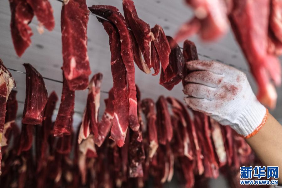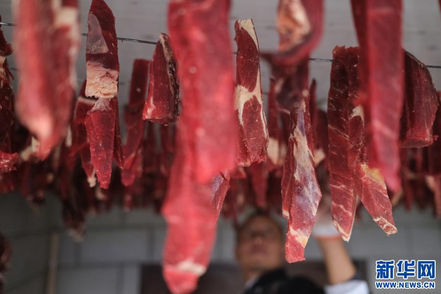 2021年1月2日,在拉薩一民居內(nèi),藏族群眾將切好的牦牛肉懸掛在通風(fēng)處,制作風(fēng)干肉。新華社記者 晉美多吉 攝
