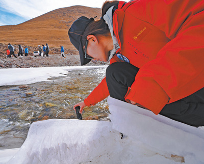 科研人員在冰面上取樣。