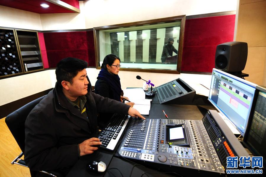 在中國(guó)西藏廣播電影電視藏語(yǔ)節(jié)目譯制中心,工作人員正在為影片《催眠大師》進(jìn)行藏語(yǔ)配音(2015年12月11日攝)。新華社記者晉美多吉 攝