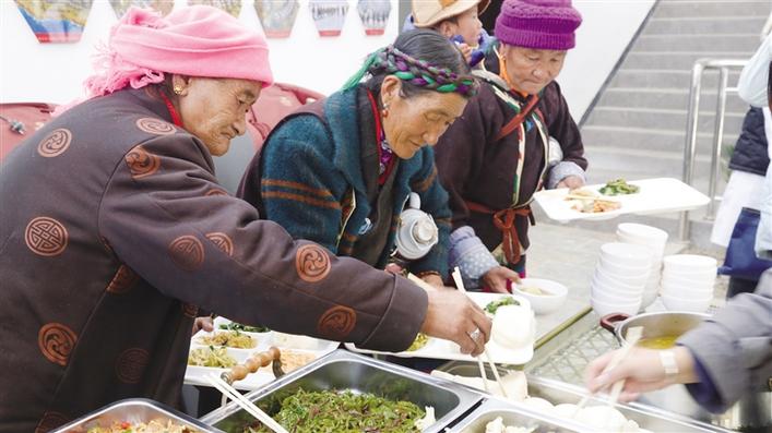 首批入住的農牧民正在打飯。圖由董治剛提供