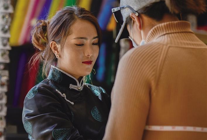“老板,你家還有這款藏裝嗎?我想要一款。”在該店內(nèi),市民卓嘎拿出手機(jī),指著格桑措姆錄制的藏裝短視頻說道?!坝械模@是我們今年推出的新款,是對(duì)傳統(tǒng)的藏裝進(jìn)行了改良,主要是體現(xiàn)在領(lǐng)口處,改良后的藏裝對(duì)領(lǐng)口部位進(jìn)行了復(fù)古簡(jiǎn)約化設(shè)計(jì),使其兼具美觀性與舒適性,再搭配一個(gè)‘卡烏’堪稱完美?!备裆4肽方榻B道。