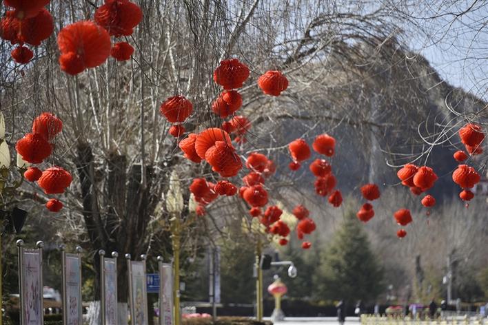 紅色總會(huì)給人以一種喜慶的感覺(jué)!走在拉薩的街頭,一串串紅彤彤的燈籠高高掛在樹(shù)枝上,錯(cuò)落有致,格外吸引眼球。除了大街小巷上用于裝飾的紅燈籠,過(guò)年時(shí)每個(gè)人家里也必定少不了紅色的點(diǎn)綴,走進(jìn)年貨市場(chǎng),人們左顧右盼,精心挑選著印有“扎西德勒”、“吉祥如意”等字樣的對(duì)聯(lián)、年畫(huà),此外,各種“?!痹氐募槲飩涫苁忻袂嗖A。