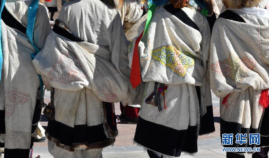藏北當雄縣幾名男子的羊皮袍子上的美麗花紋(2月12日攝)新華社記者 覺果 攝