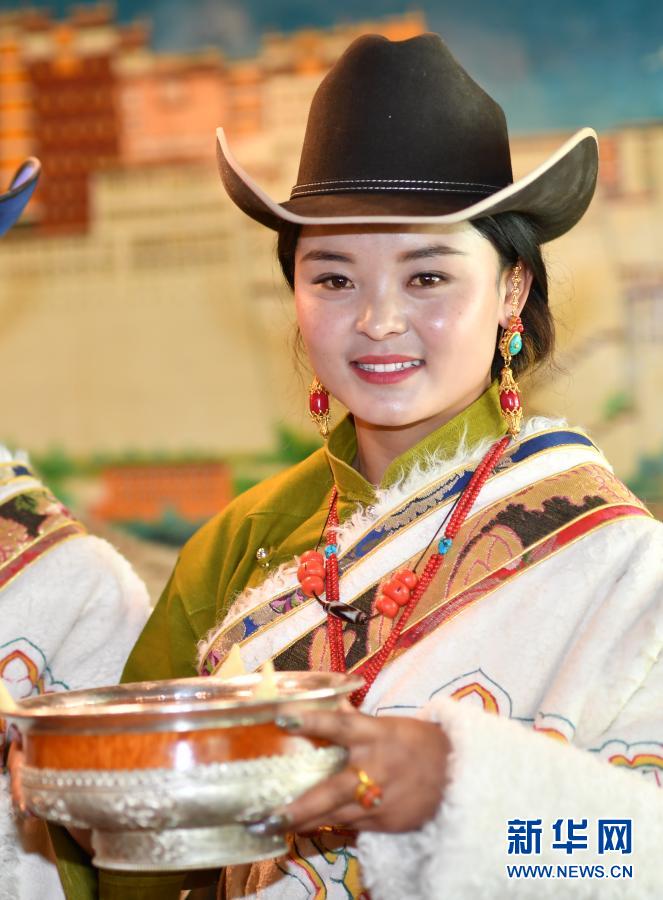 2月12日,在藏北當雄縣沖噶村,一名牧民盛裝敬酒。新華社記者 覺果 攝