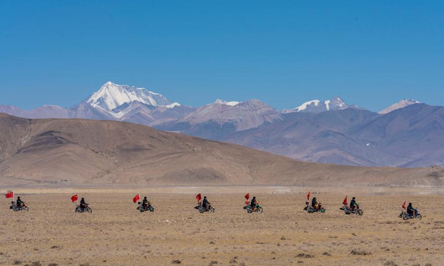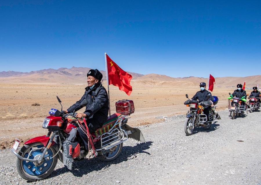 西藏日喀則市薩嘎縣昌果鄉(xiāng)的一處村莊里,48歲的藏族漢子石覺塔布在風(fēng)中跨上一輛摩托車,向平坦無垠的高原邊緣騎去。他的車尾插著一面五星紅旗,被風(fēng)吹得獵獵作響,即便駛出很遠(yuǎn),那抹紅色在車輪卷起的煙塵中也依然醒目。