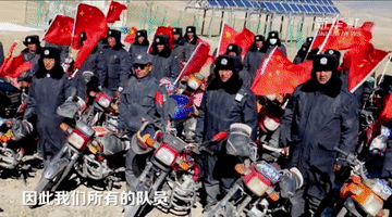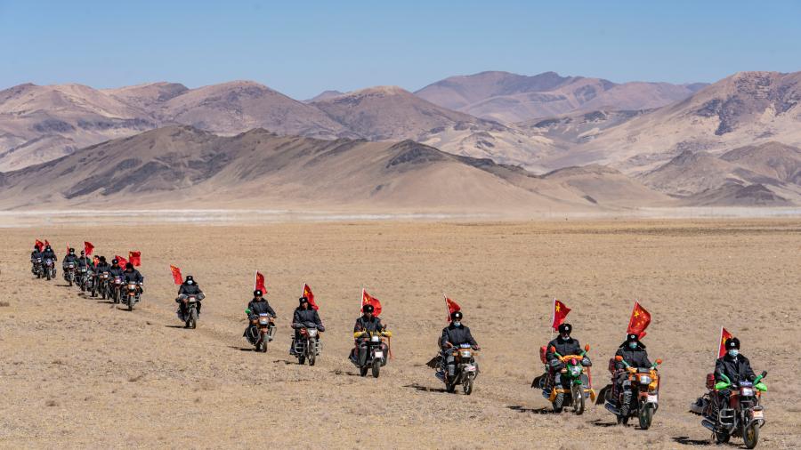 夜幕降臨高原,一天的訓(xùn)練結(jié)束。隊員們騎著車從鄉(xiāng)里散去,出發(fā)前不忘再緊一緊車尾的國旗。一輪明月懸在喜馬拉雅山脈的群山上,照亮了守邊人的回家路。