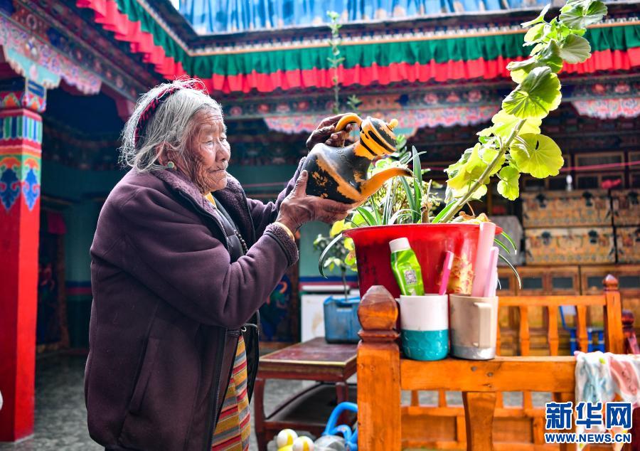 沖多在家里澆水養(yǎng)花(1月15日攝)。新華社記者 晉美多吉 攝