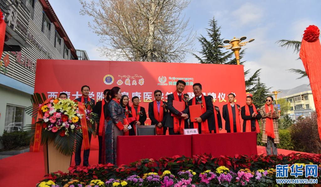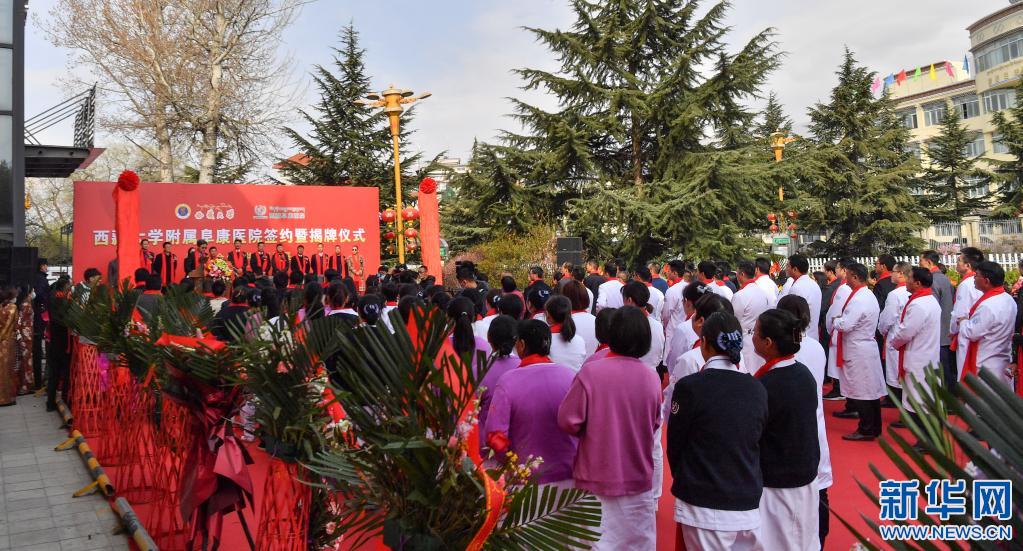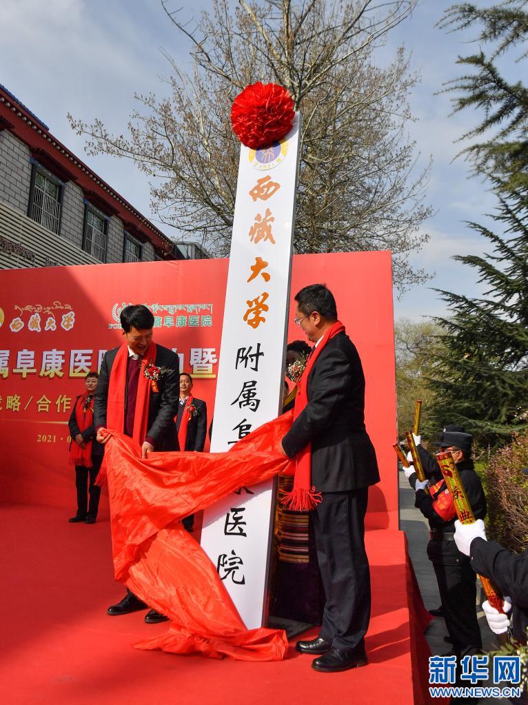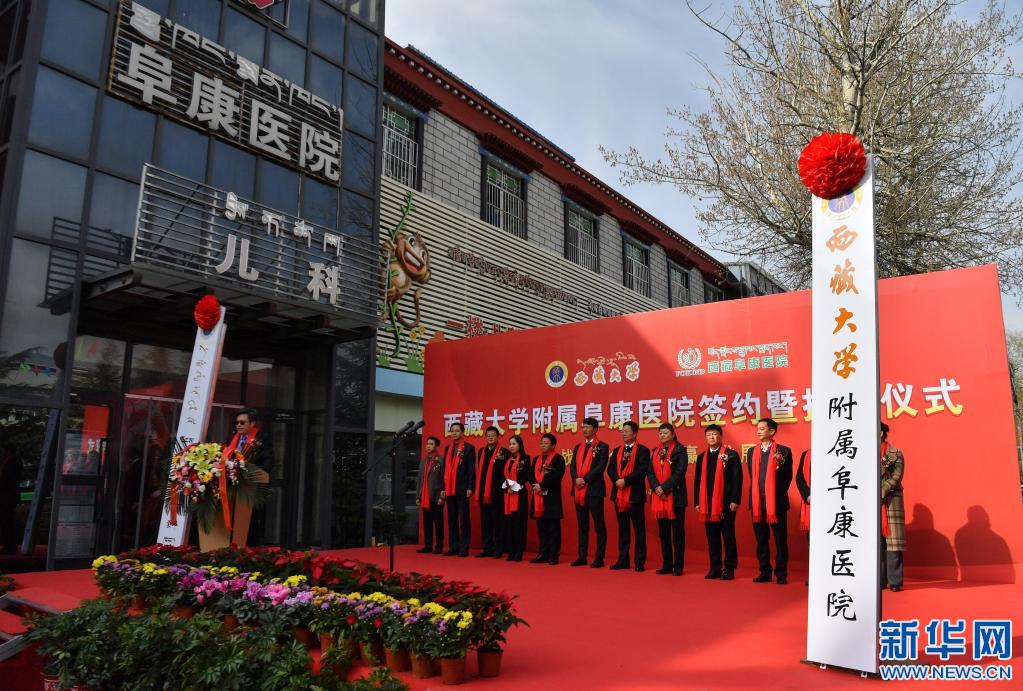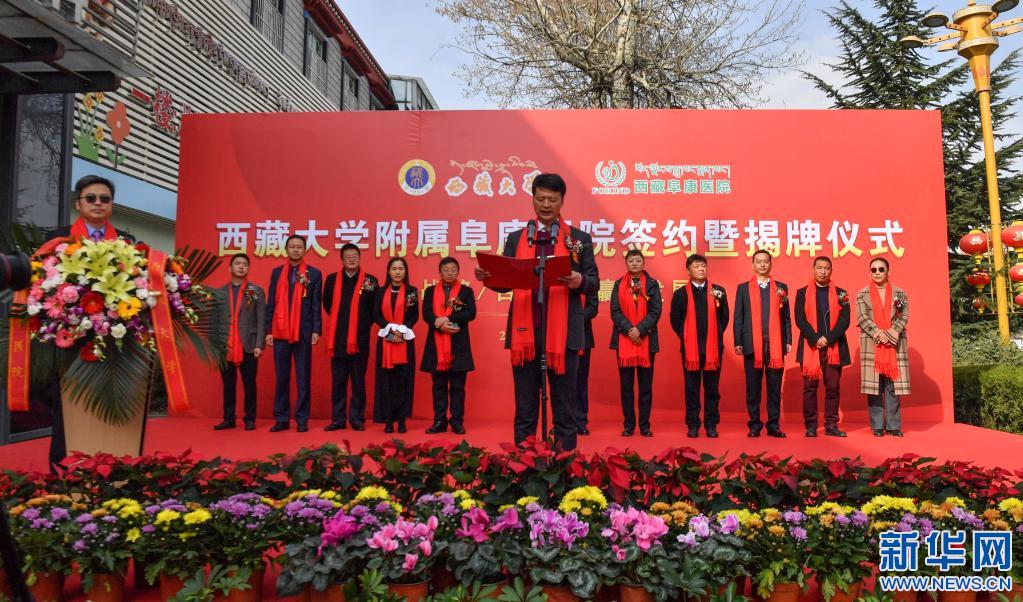 西藏大學附屬阜康醫(yī)院簽約暨揭牌儀式現(xiàn)場(4月7日攝)。