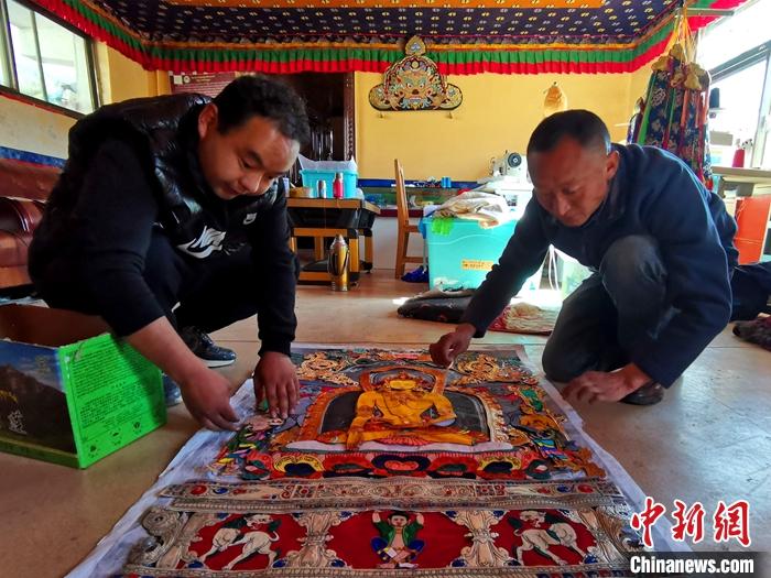 4月5日,拉薩堆繡唐卡技藝傳承人羅布(右)正在和學(xué)生共同完成一幅新的堆繡唐卡。中新社記者 趙延 攝