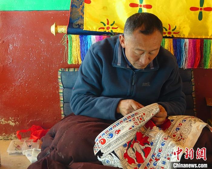 4月5日,拉薩堆繡唐卡技藝傳承人羅布正在進行創(chuàng)作。中新社記者 冉文娟 攝