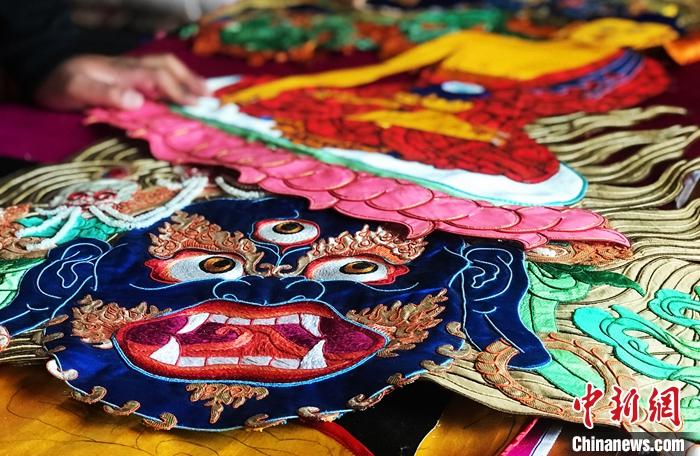 4月5日,記者拍攝的正在創(chuàng)作中的拉薩堆繡唐卡作品。中新社記者 冉文娟 攝