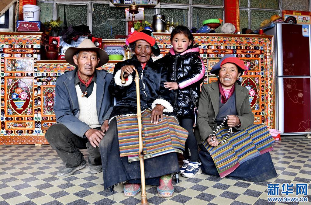 拉確老人(左二)和大女婿巴桑(左一)、大女兒桑姆(右一)及重外孫女白瑪央拉一起在家中合影(4月16日攝)。新華社記者 張汝鋒 攝