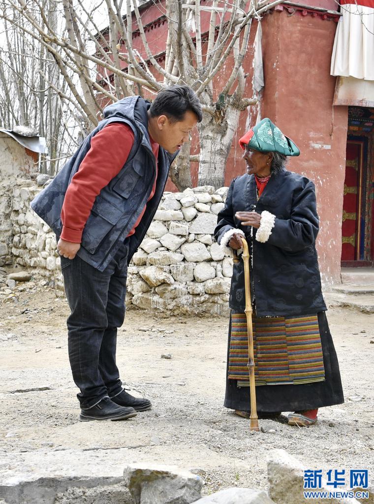 拉確老人(右)和來走訪的鄉(xiāng)干部嘮家常(4月16日攝)。新華社記者 張汝鋒 攝