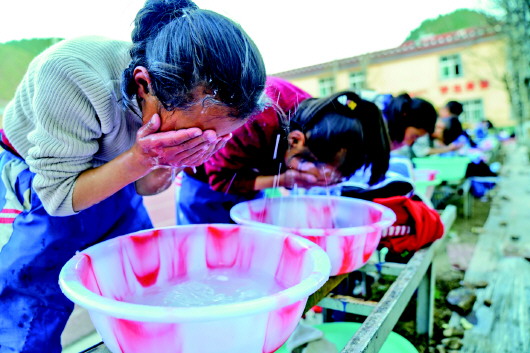 4月30日,在類烏齊縣桑多鎮(zhèn)第二小學(xué),學(xué)生們用熱水洗漱。這套熱水設(shè)施由李純民發(fā)起的“齊興”助學(xué)獎勵基金捐助?!∮浾邉⒔鸷?、黃臻攝