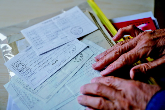 4月22日,李純民在天津家中展示向青藏鐵路建設(shè)捐款的部分匯款單存根。記者劉金海、黃臻攝