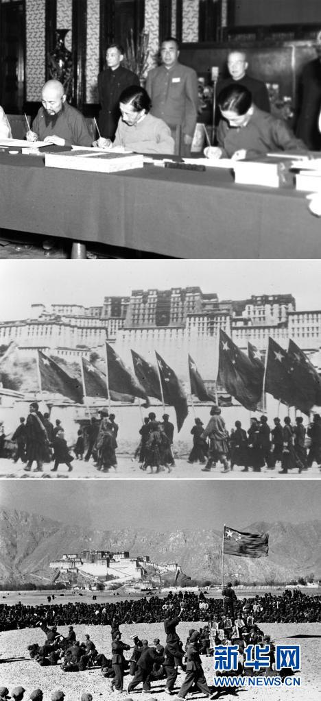 這是一張拼版照片:上圖為1951年5月23日,中央人民政府與西藏地方政府在北京簽訂《關(guān)于和平解放西藏辦法的協(xié)議》(簡稱“十七條協(xié)議”)。上圖為西藏地方政府代表在協(xié)議上簽字;中圖為1951年10月26日,西藏地方政府為人民解放軍舉行了隆重的入城式,拉薩古城飄揚(yáng)著五星紅旗;下圖為西藏和平解放后,人民解放軍與藏族群眾在布達(dá)拉宮前歡度新年。