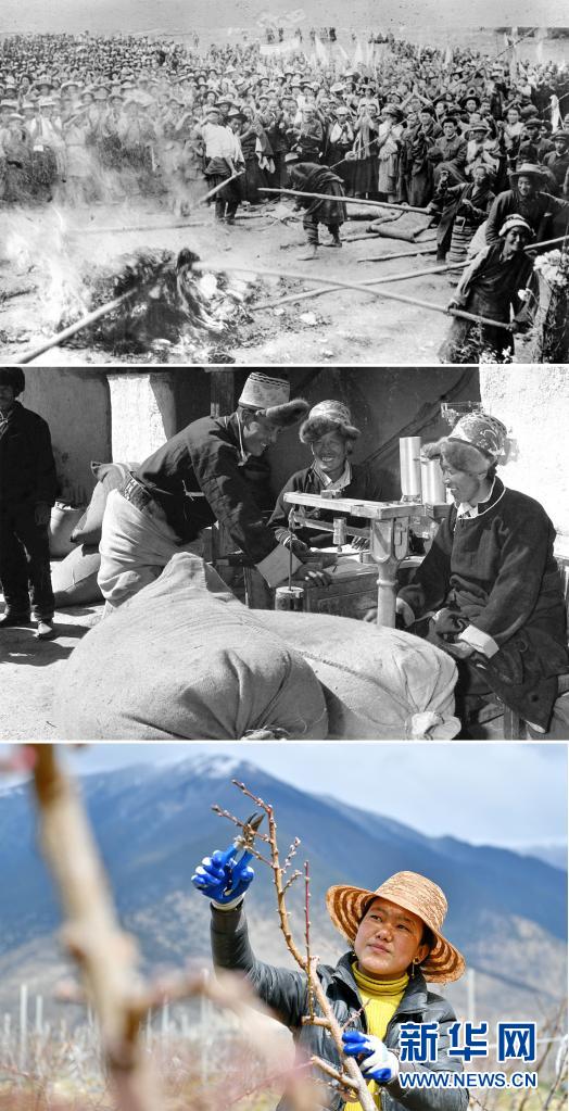這是一張拼版照片:上圖為1959年8月,西藏墨竹工卡縣的翻身農(nóng)奴焚燒三大領(lǐng)主的剝削文契(新華社發(fā));中圖為1984年,江孜縣農(nóng)民洛桑旺堆(左)向國家出售余糧。他家承包土地100多畝,農(nóng)忙種地,農(nóng)閑搞建筑、跑運(yùn)輸(新華社記者土登攝);下圖為2020年3月22日,西藏林芝現(xiàn)代蘋果標(biāo)準(zhǔn)化示范園的工作人員為桃樹剪枝。該示范園實施農(nóng)機(jī)農(nóng)藝結(jié)合、水肥一體化及“果草畜循環(huán)”,大面積推廣蘋果矮砧集約高效栽培技術(shù),帶動米林縣羌納鄉(xiāng)林巴、才巴、色沃村及附近的農(nóng)戶增收(新華社記者 張汝鋒 攝)。新華社發(fā)