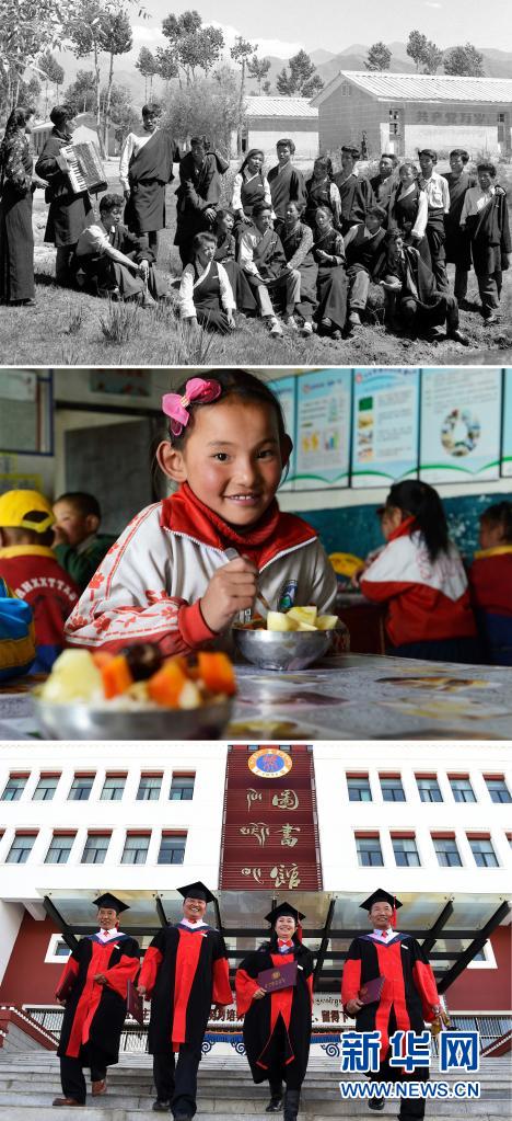 這是一張拼版照片:上圖為拉薩中學(xué)的應(yīng)屆畢業(yè)生在校園里練歌,準(zhǔn)備參加畢業(yè)典禮(新華社記者任用昭攝);中圖為一名藏族女孩在西藏雙湖縣嘎措鄉(xiāng)小學(xué)內(nèi)享受“三包”(包吃、包住、包學(xué)習(xí)費(fèi)用)政策(2014年6月29日新華社記者普布扎西攝);下圖為2017年11月10日,西藏大學(xué)舉行首屆博士研究生畢業(yè)典禮,向4名畢業(yè)生授予博士學(xué)位。這4名博士分別來自藏族歷史專業(yè)、藏語言文學(xué)專業(yè)及高原醫(yī)學(xué)專業(yè)(新華社記者覺果攝)。新華社發(fā)