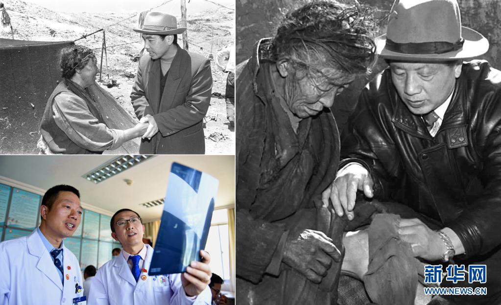 這是一張拼版照片:左上圖為來自陜西的援藏干部阿里日土縣副縣長賈冗勇深入牧區(qū),幫助藏族牧民解決生產(chǎn)、生活的實際困難(新華社記者土登攝 1997年11月11日發(fā));左下圖為2017年8月3日,北京積水潭醫(yī)院援藏醫(yī)生龔曉峰(右)和北京天壇醫(yī)院援藏醫(yī)生李家謀在拉薩市人民醫(yī)院骨科病房內(nèi)查看患者的X光片,進(jìn)行工作交接(新華社記者晉美多吉攝);右圖為孔繁森(右)在阿里日土縣過巴鄉(xiāng)為孤寡老人益西卓瑪治?。ㄐ氯A社記者土登攝 1994年12月26日發(fā))。新華社發(fā)