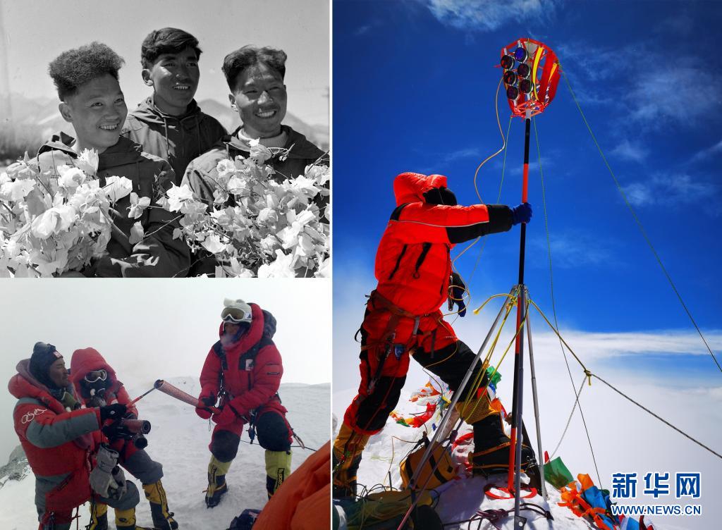 這是一張拼版照片:左上圖為1960年5月登上珠穆朗瑪峰頂?shù)闹袊巧疥犼爢T王富洲(右)、貢布(中)和屈銀華(資料照片 新華社發(fā));左下圖為2008年5月8日,北京奧運(yùn)圣火珠峰傳遞登山隊隊員羅布占堆(左)點(diǎn)燃第一棒火炬手吉吉手中的“祥云”火炬(新華社發(fā));右圖為2020珠峰高程測量登山隊隊員在珠穆朗瑪峰峰頂開展測量工作(2020年5月27日新華社特約記者扎西次仁攝)。新華社發(fā)