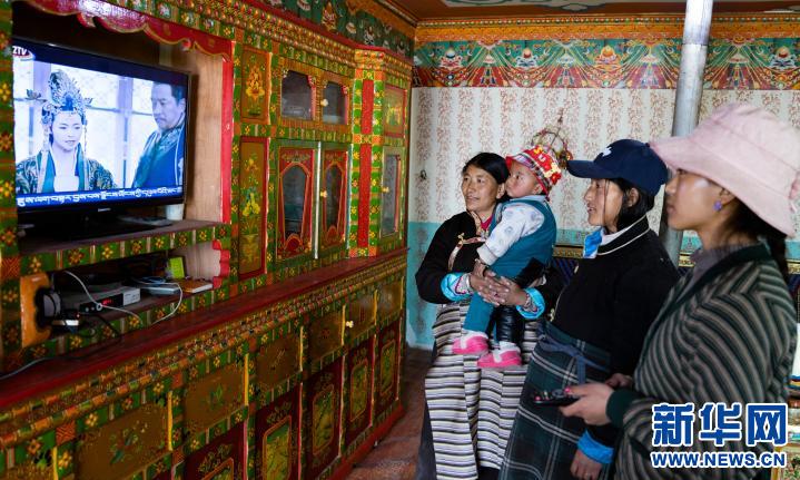 西藏山南市浪卡子縣普瑪江塘鄉(xiāng)的群眾在新建成的“小康房”里看電視。(2020年4月15日攝)新華社記者 普布扎西 攝。