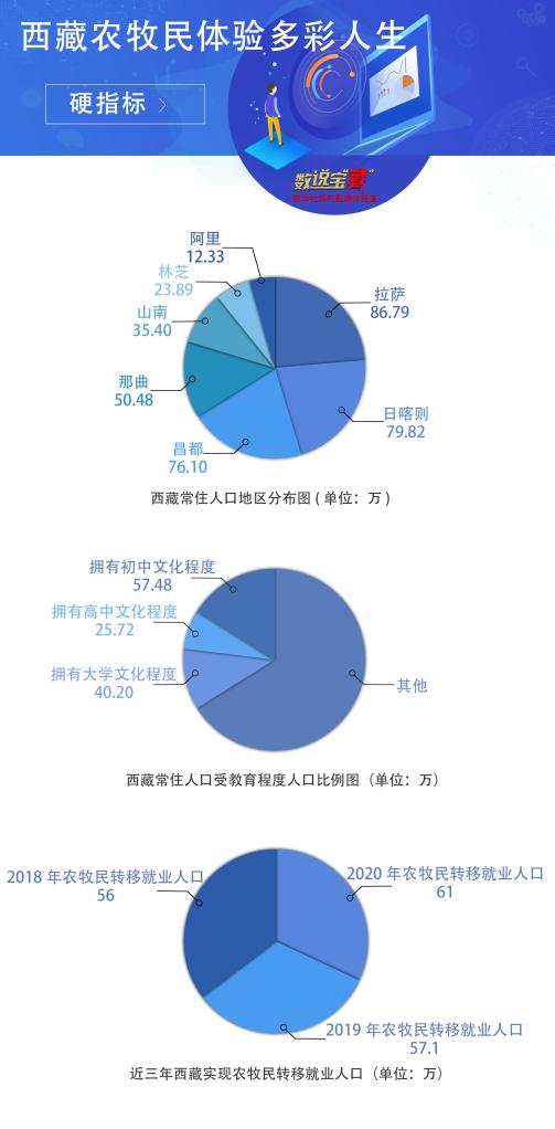 數(shù)據(jù)顯示,西藏和平解放70年來,常住人口從100多萬人增加到364.81萬人。2019年底,西藏74個(gè)貧困縣全部摘帽,62.8萬建檔立卡貧困人口全部脫貧。2020年,西藏地區(qū)生產(chǎn)總值突破1900億元,同比增長7.8%。