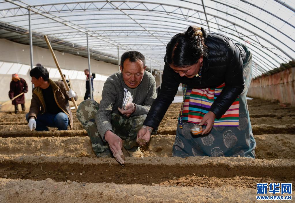 2018年3月13日,西藏阿里地區(qū)噶爾縣生態(tài)農(nóng)業(yè)產(chǎn)業(yè)園農(nóng)技人員楊茂錄(右二)在園區(qū)大棚中為當(dāng)?shù)刎毨羰_桑嘎(右)傳授瓜果種植技術(shù)。新華社記者 劉東君 攝
