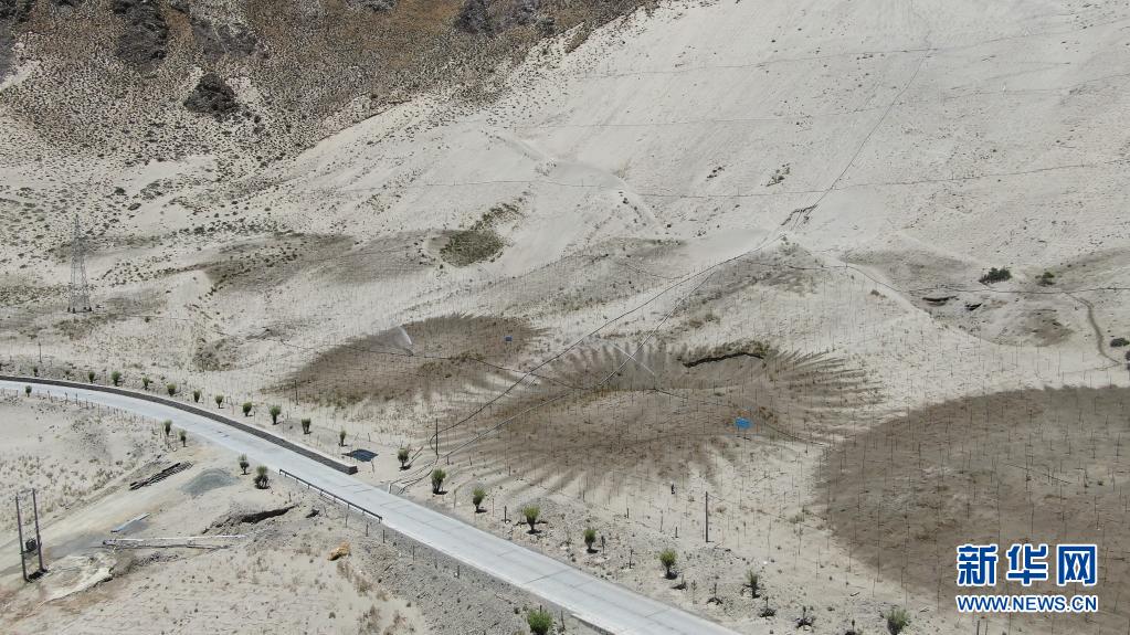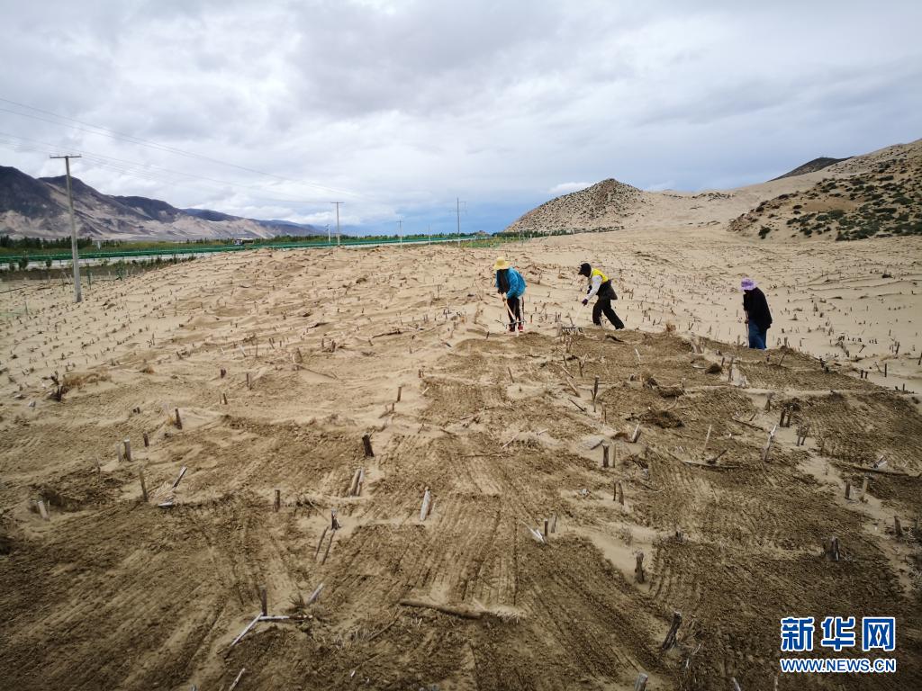 在山南市雅魯藏布江河谷地帶,村民們?cè)诰S護(hù)固沙用的草方格(2019年7月14日攝)。新華社發(fā)(資料照片)