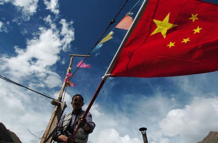 青藏鐵路沿線的藏族群眾紛紛掛起國旗,喜迎青藏鐵路全線通車。