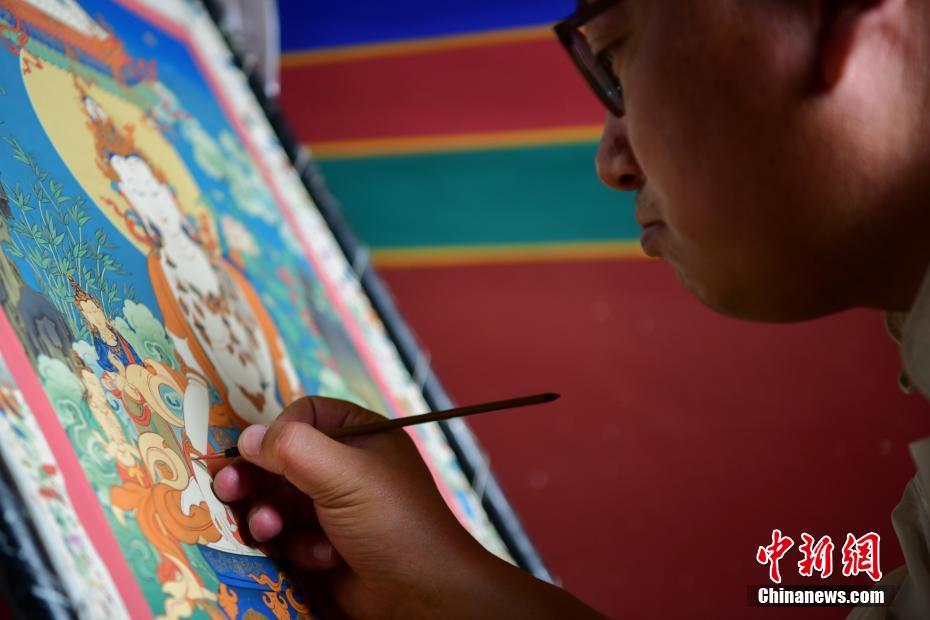 6月12日,2021年“文化和自然遺產(chǎn)日”西藏非遺展演展示系列活動(dòng)在拉薩舉行。活動(dòng)現(xiàn)場融入了文藝演出、非遺展演、非遺產(chǎn)品展銷等內(nèi)容,市民游客可親身體驗(yàn)非遺產(chǎn)品的制作過程。圖為非遺傳承人在手繪唐卡?!?中新社記者 貢嘎來松 攝