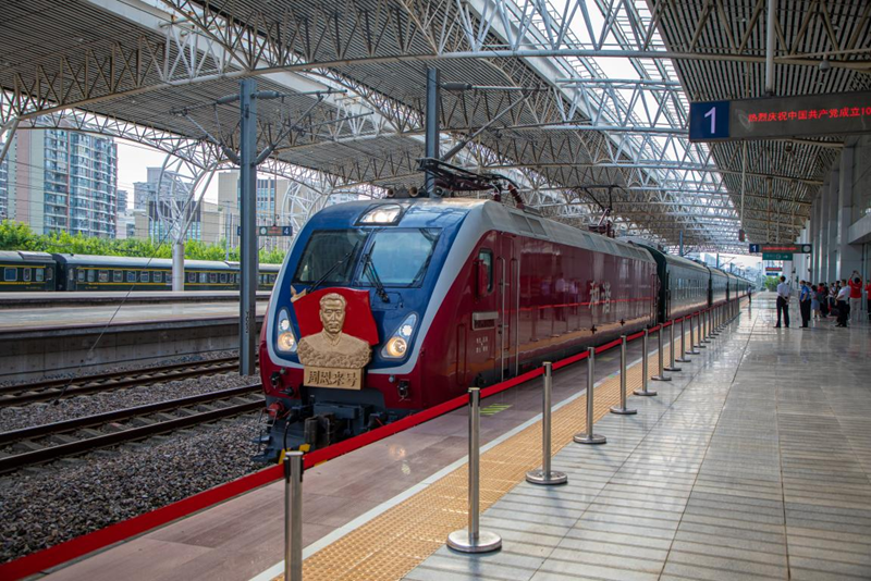 紅色旅游列車駛?cè)胝九_(tái)。
