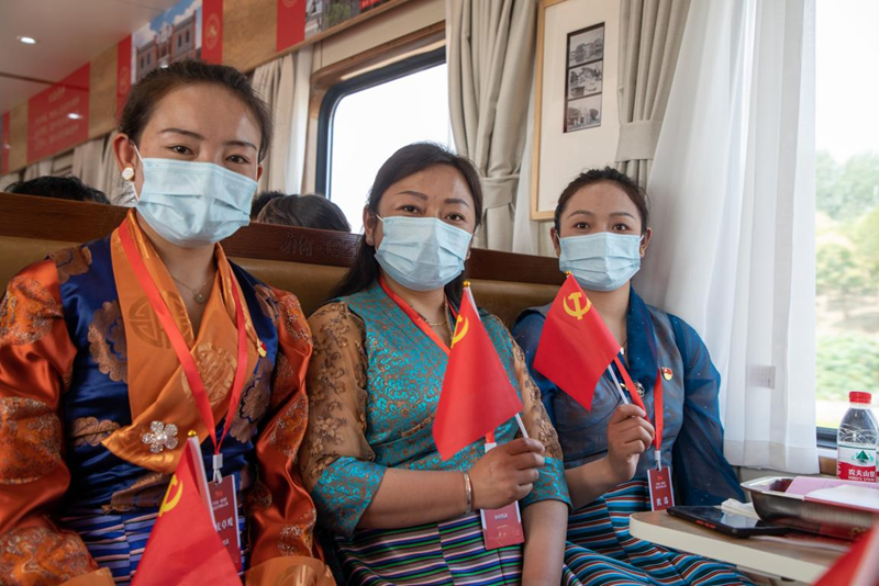 “五星紅旗迎風(fēng)飄揚(yáng),勝利歌聲多么響亮!歌唱我們親愛的祖國(guó),從今走向繁榮富強(qiáng)……“代表團(tuán)成員才旺金美引領(lǐng)大家唱起《歌唱祖國(guó)》,雄厚嘹亮的歌聲飄蕩在車廂里。專列上,每個(gè)車廂、每個(gè)團(tuán)隊(duì)都有自己的主題活動(dòng),那曲市色尼區(qū)代表團(tuán)以講一段故事、學(xué)一節(jié)黨史、唱一首紅歌追溯紅色記憶,重溫黨的光輝歷程。