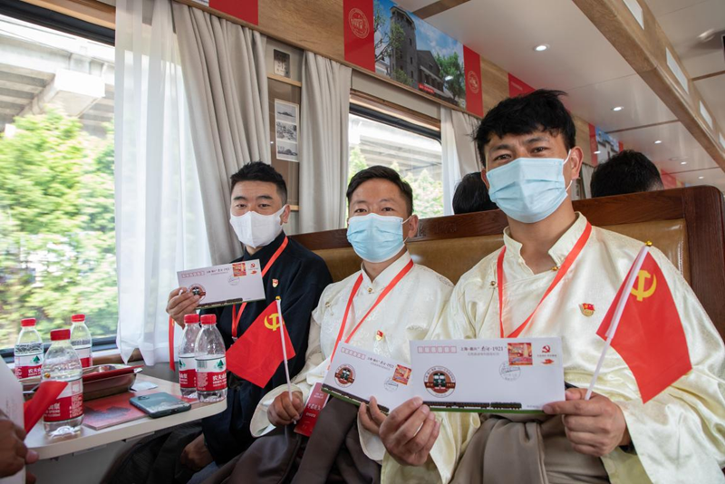 6月25日上午,上海至嘉興的“南湖·1921”紅色旅游列車正式開通。上午8時(shí),身著藏裝的西藏自治區(qū)那曲市色尼區(qū)代表團(tuán)乘上列車前往嘉興。