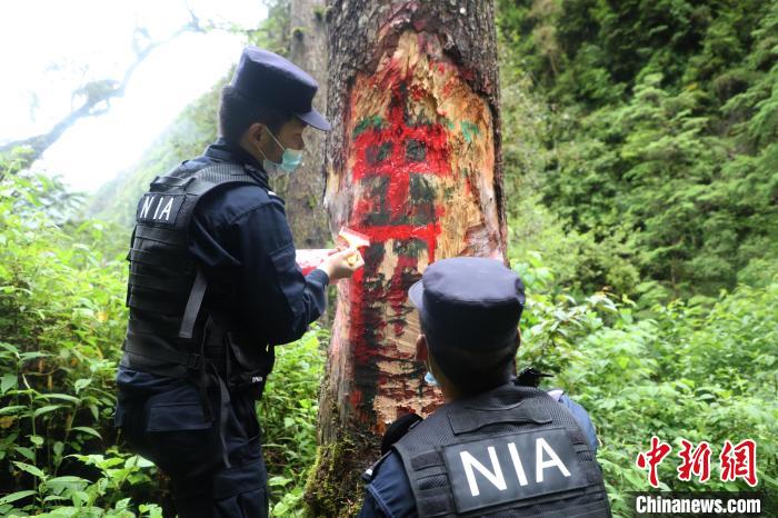 圖為三安曲林邊境派出所移民管理警察在邊境山口噴繪主權(quán)標志物。山南邊境管理支隊供圖