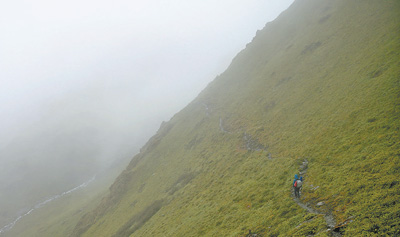 日子再苦,定期巡山是桑杰曲巴雷打不動的工作。一袋熟土豆,一把開山刀,就是巡山的全部裝備。白天,用刀劈開密不透風的荊棘和灌木,在青苔泥濘的林間冒雨穿行;夜晚,在石縫樹洞里躲避野獸。餓了吃點土豆,渴了掬一捧溪水,累了靠在樹下休息。每次巡山前,桑杰曲巴總要叮囑姐妹倆,兩天就能回來,如果第三天還沒回來,趕緊出山去曲桑報信。巡山路上,桑杰曲巴檢查著自己以前楔下的木樁、掛上的國旗、刻下的文字。木樁如果被人拔掉了,他就重新楔上。國旗不見了,他就再次掛上。