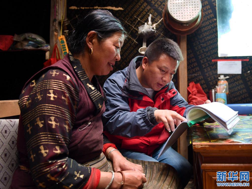 西藏山南市社保工作人員在隆子縣玉麥鄉(xiāng)玉麥村村民央宗家中進(jìn)行社保信息補(bǔ)充登記。新華社記者 晉美多吉 攝