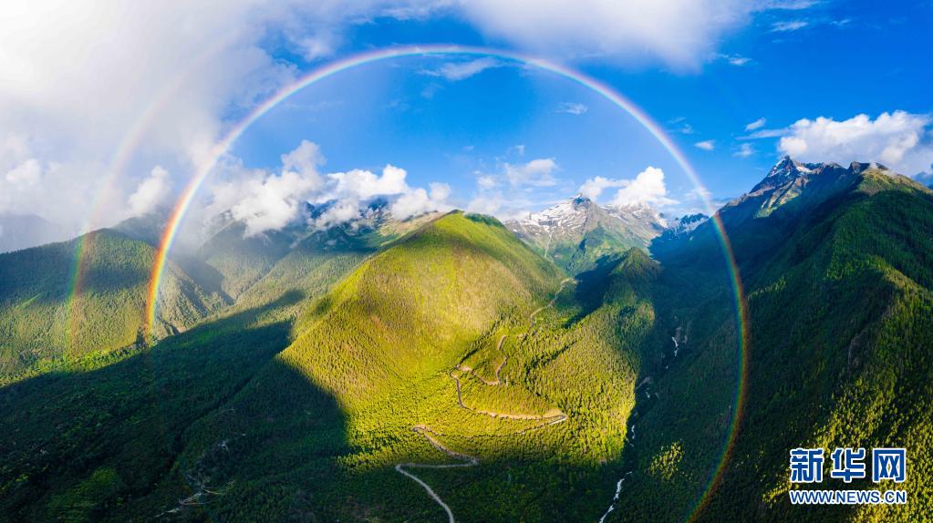 這是7月6日拍攝的米林縣派鎮(zhèn)至墨脫公路上的彩虹(無人機照片)。新華社發(fā)(董志雄 攝)