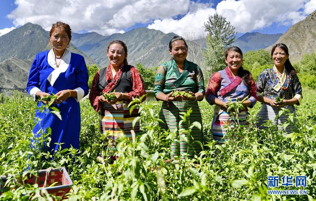林芝市朗縣洞嘎鎮(zhèn)滾村的村民展示剛剛采摘的辣椒(2020年7月27日攝)。新華社記者 張汝鋒 攝