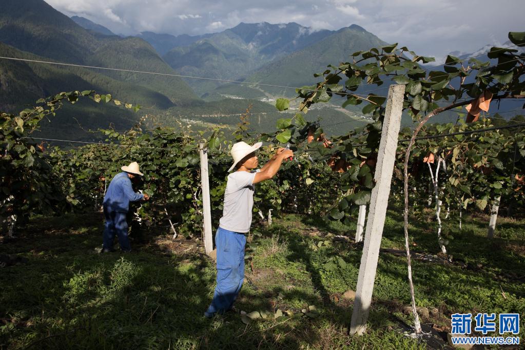 在西藏自治區(qū)林芝市察隅縣下察隅鎮(zhèn)京都村,獼猴桃園工作人員在修剪獼猴桃枝葉(7月22日攝)。京都村通過“公司+農戶”模式引進了獼猴桃種植,幫助村民增收。新華社記者 金立旺 攝