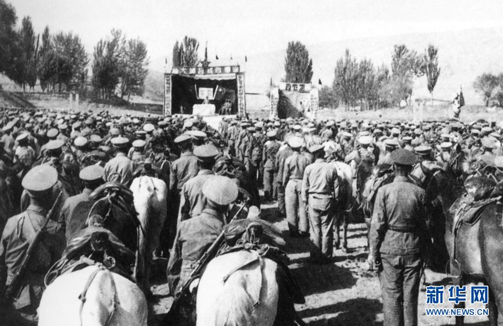 獨(dú)立騎兵師一團(tuán)在新疆于田縣普魯村召開進(jìn)藏誓師大會(資料照片)。新華社發(fā)(進(jìn)藏英雄先遣連紀(jì)念館供圖)